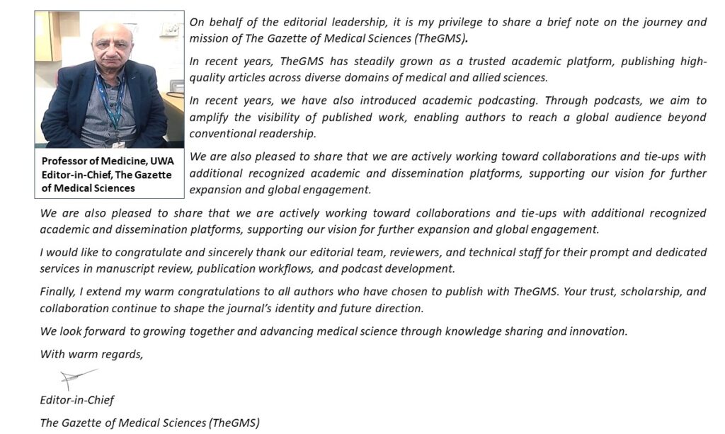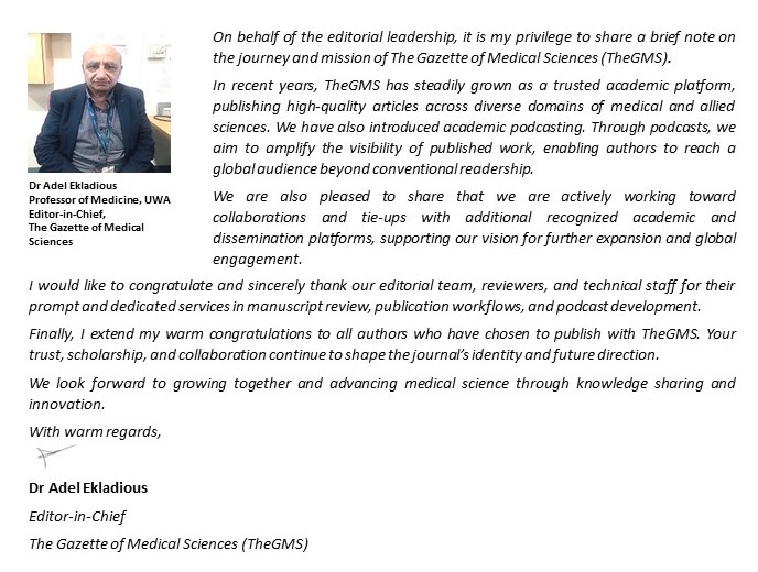 The Gazette of Medical Sciences (TheGMS) is a rapidly growing international journal publishing in all scientific and medical domains. We welcome every type of paper — research, reviews, case studies, and opinions — with a fast and effortless publication process. Your work receives global visibility among 10+ million readers, along with active article promotion and podcast features on Spotify and Apple Podcasts for maximum reach. Backed by a strong Google Scholar citation record, TheGMS offers authors a unique opportunity to publish, promote, and be recognized worldwide.